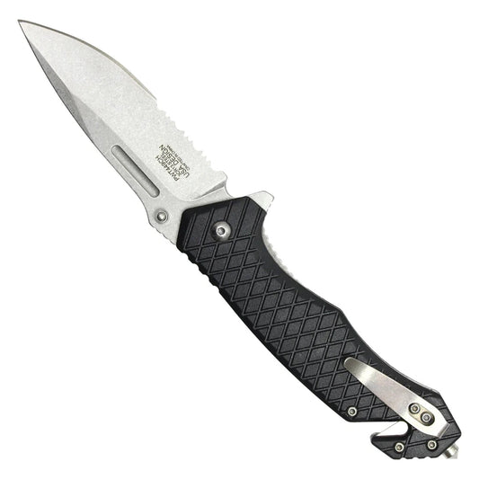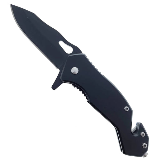 6.5" Overall Spring Assisted Knife W/Seat Belt Cutter And Window Breaker Matte Black Coated - T27033BK