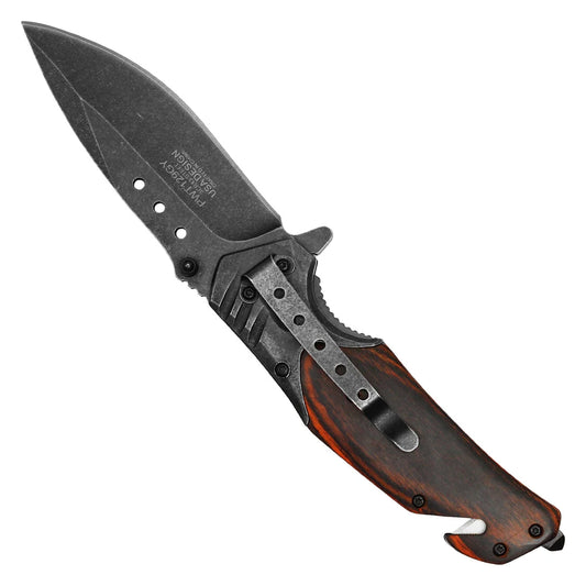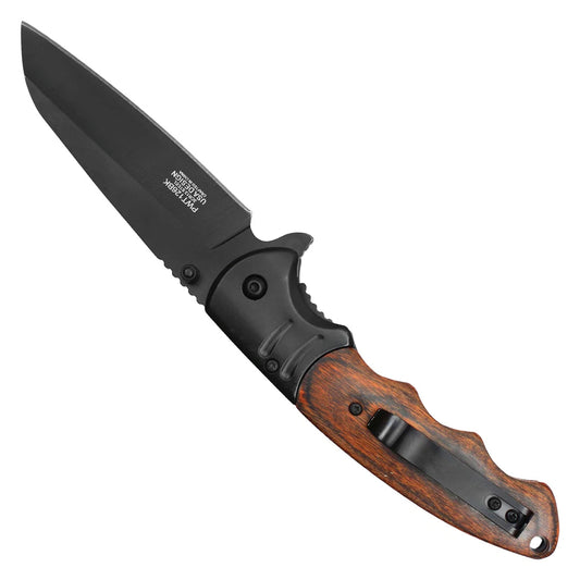 Wartech 8.5" Black Pocket Knife with wood inlay handle - PWT129BK