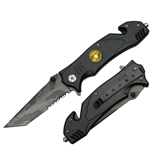 8" Spring Assist Marines Black Serrated Tanto Blade Pocket Knife - T1047051MA
