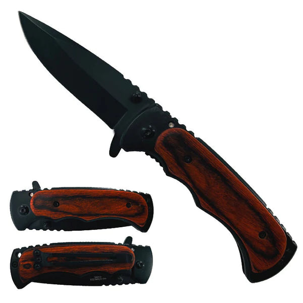 This 7.75" Overall Knife features a stunning Black design on its 440 stainless steel coated blade and 4- 3/4" wood on stainless handle. Its 3 " Black Titanium blade to ensure its lasting durability.