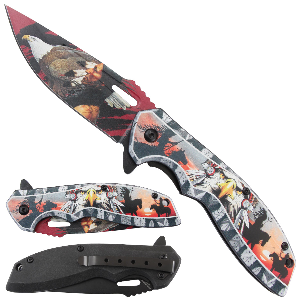 4.5" Spring assisted knife, plastic handle with Native American 3D print -KS1103EG