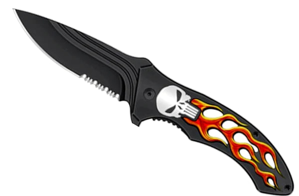 This 7 1/4" spring assisted knife features a 440 stainless steel blade and a Skull Red Flame handle. It offers reliable durability and resistance to corrosion, making it a great option for outdoor applications. Its simplistic design is both attractive and easy to use.