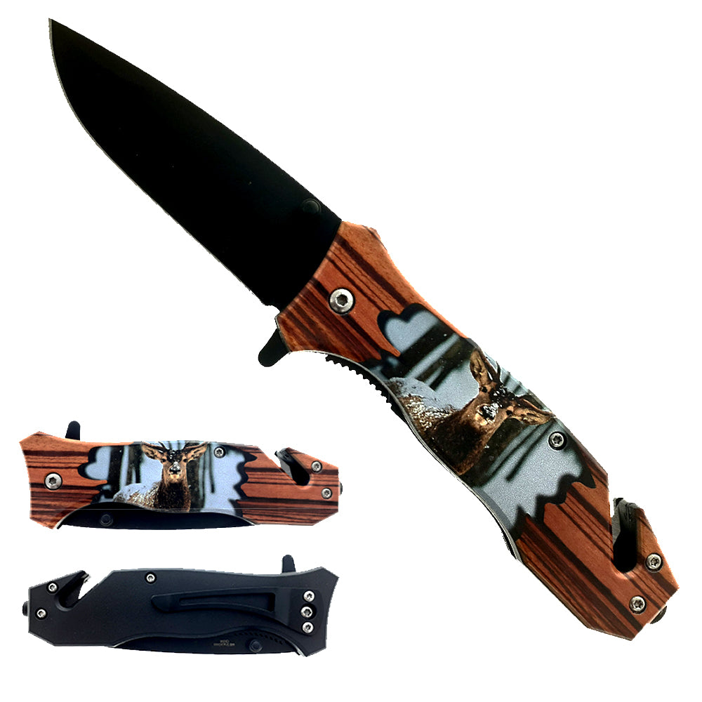 This 8 1/2" spring assisted knife features a wooden handle etched with an deer design and a black 440 stainless steel coated blade. It also includes a belt clip, seatbelt cutter, and glass breaker, offering enhanced versatility and safety.