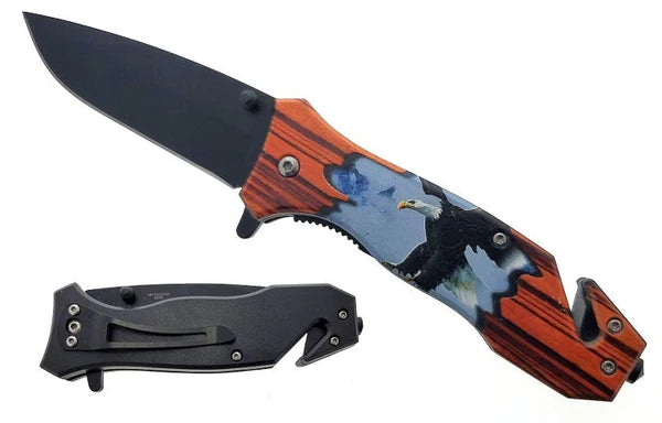 This 8 1/2" spring assisted knife features a wooden handle etched with an eagle design and a black 440 stainless steel coated blade. It also includes a belt clip, seatbelt cutter, and glass breaker, offering enhanced versatility and safety.