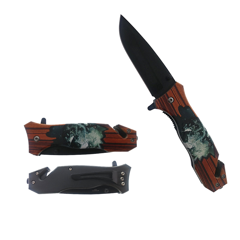 This 8 1/2" spring assisted knife features a wooden handle etched with an wolf design and a black 440 stainless steel coated blade. It also includes a belt clip, seatbelt cutter, and glass breaker, offering enhanced versatility and safety.