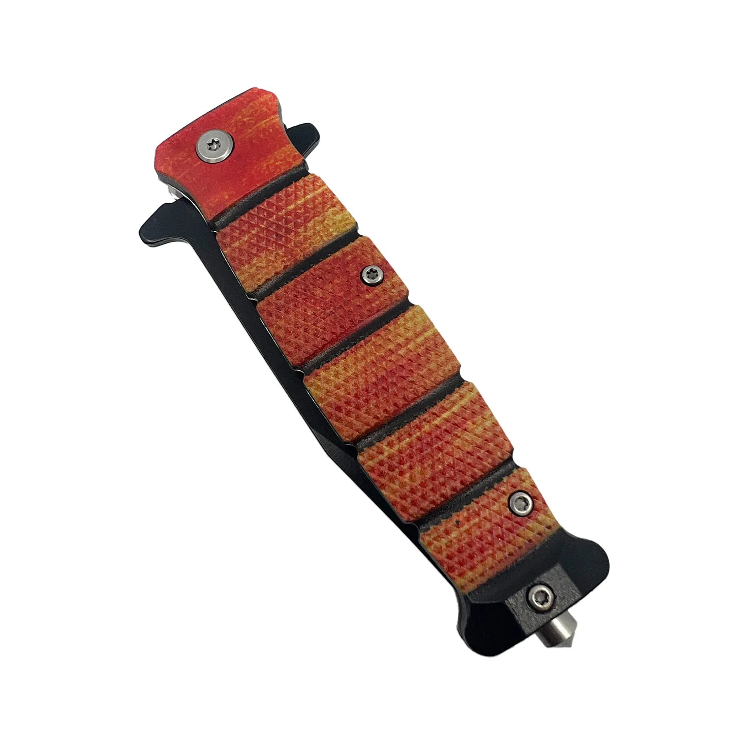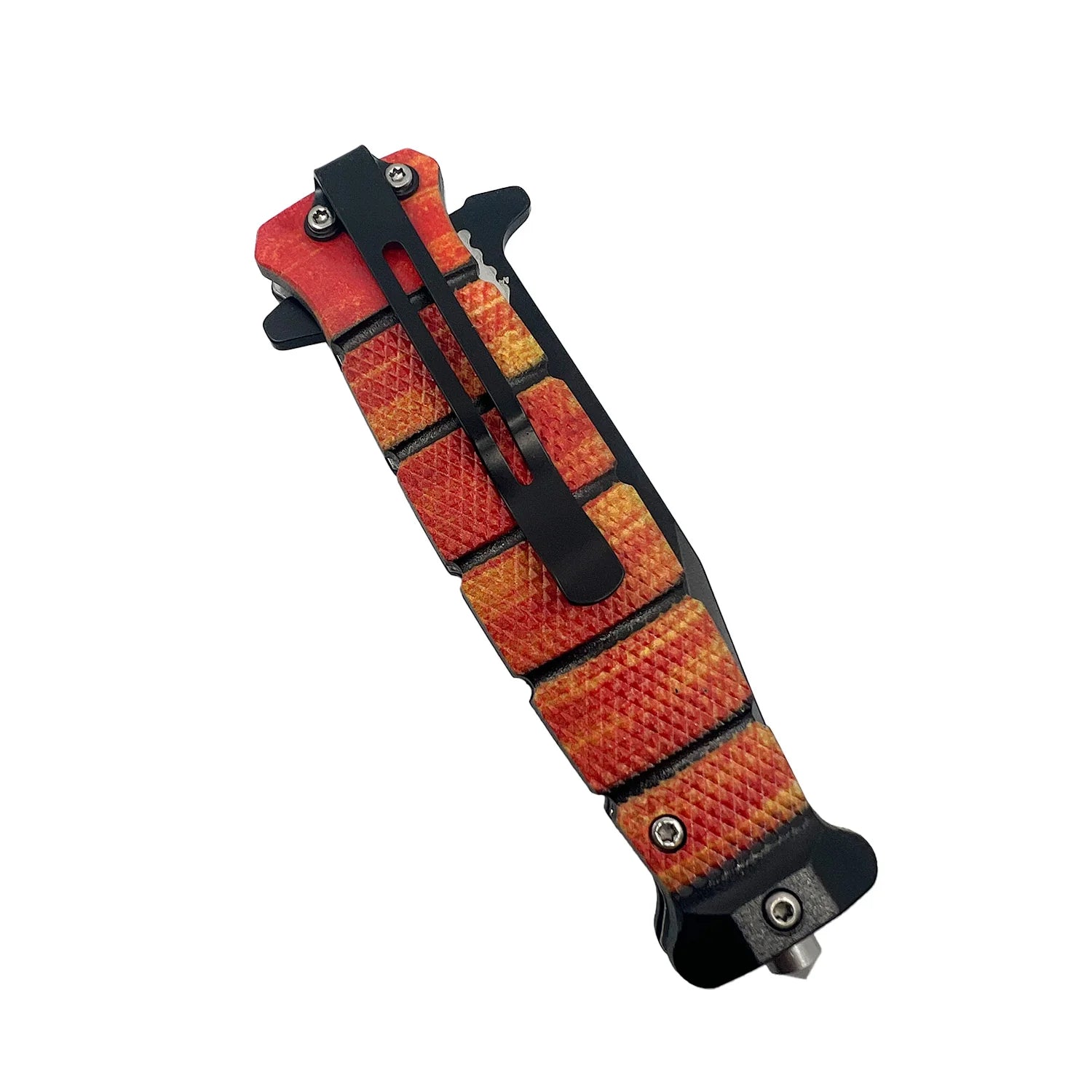 This semi-automatic folding knife boasts a black tanto blade made of 440 black coated stainless steel, measuring 3.5". The 4.75" handle is crafted with a leather-like finish, and when fully opened, the knife measures 8.25". With an open half-tooth blade, this knife is designed for durability and long-lasting use.