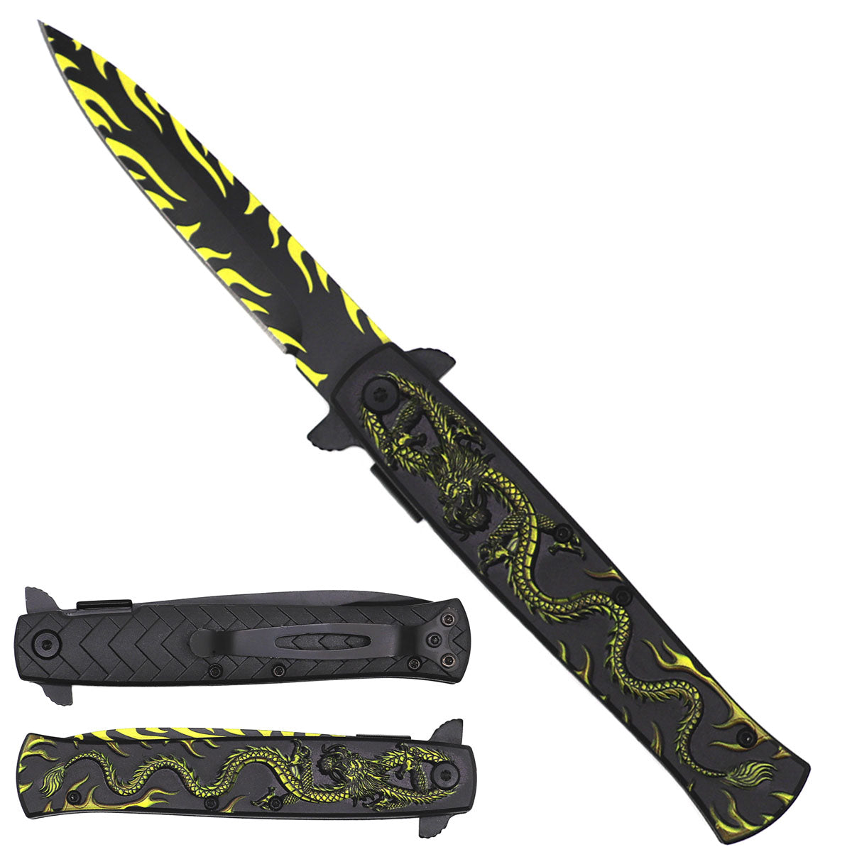 This 8 3/4" Black Folding Knife is built with a 4 3/4" Gold Dragon design on Handle and 3 1/2"" Blade Spring Assisted Knife. The 440 Stainless Steel Blade is strong and reliable, providing optimal sharpness and durability compared to similar products. Keep your gear safe and secure with this sleek Blue folding knife.