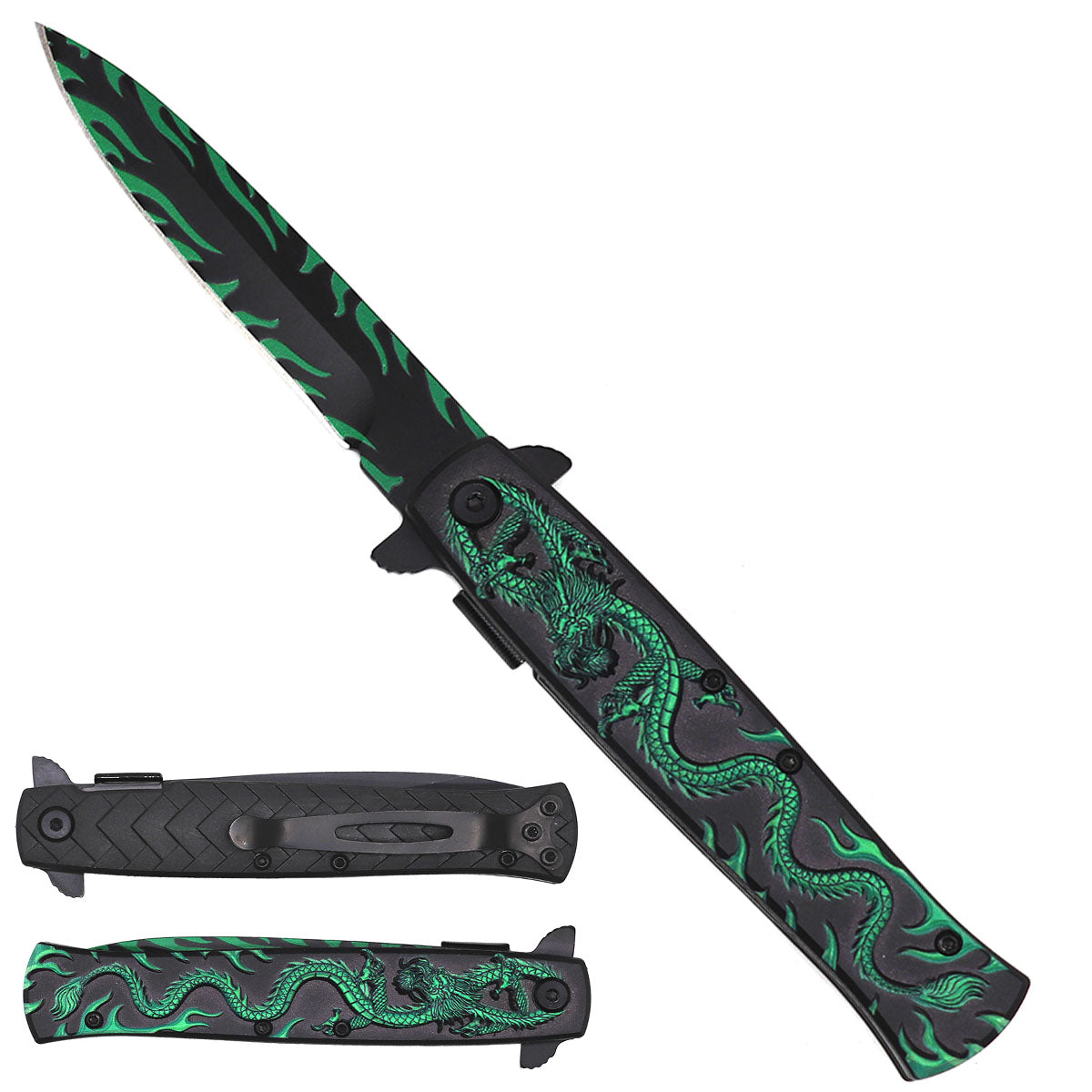 This 8 3/4" Black Folding Knife is built with a 4 3/4" Green Dragon design on Handle and 3 1/2"" Blade Spring Assisted Knife. The 440 Stainless Steel Blade is strong and reliable, providing optimal sharpness and durability compared to similar products. Keep your gear safe and secure with this sleek Blue folding knife.