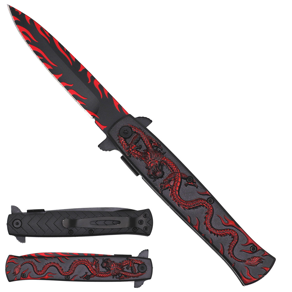 This 8 3/4" Black Folding Knife is built with a 4 3/4" Red Dragon design on Handle and 3 1/2"" Blade Spring Assisted Knife. The 440 Stainless Steel Blade is strong and reliable, providing optimal sharpness and durability compared to similar products. Keep your gear safe and secure with this sleek Blue folding knife.