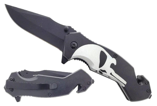 8" Black Coated Blade Skull Spring Assisted Knife - KS1031SK