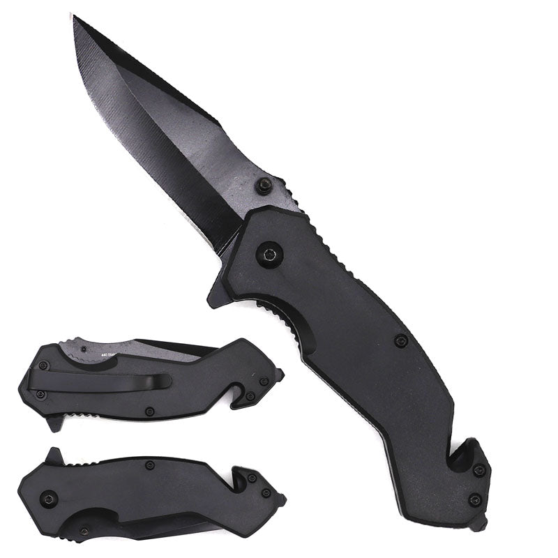 This black coated blade spring assisted knife is 8" in overall length and features a 4 1/2" black handle and a 3 1/2" 440 stainless steel blade for superior durability and corrosion resistance. Easily open and close with the spring assisted mechanism.