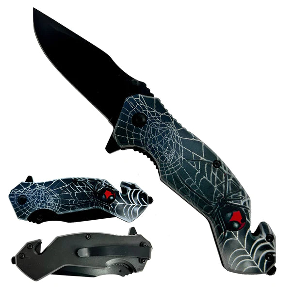 This black coated blade spring assisted knife is 8" in overall length and features a 4 1/2" black widow spider handle and a 3 1/2" 440 stainless steel blade for superior durability and corrosion resistance. Easily open and close with the spring assisted mechanism.