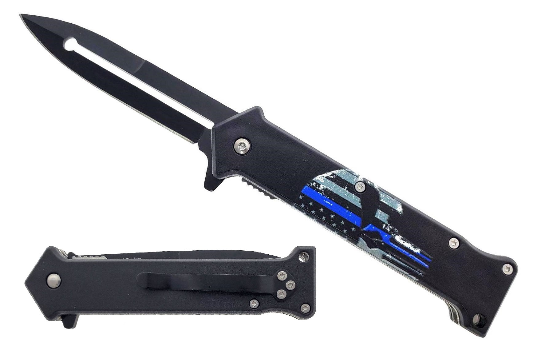 This 3 1/2" Black Half Serrated Blade Folding Knife, featuring 8" of overall length, a 440 stainless steel blade, a black coating for strength and 4 1/2" blue line skull handle for comfort. With a built-in belt clip, you can always have it close. Dare to explore with confidence!