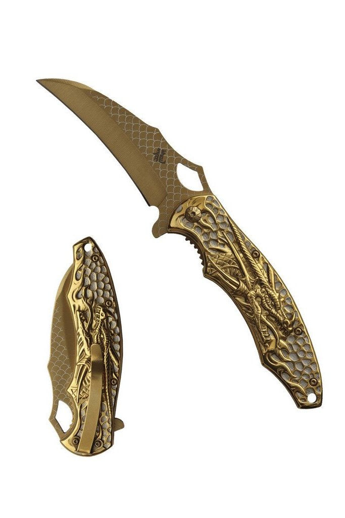 This 8" Overall in Length Spring Assisted Knife with 3D Dragon Handle Gold is ideal for everyday carrying due to its lightweight construction and ultra-durable 440 stainless steel blade. Its 8" overall length and 3.5" blade provide the perfect balance of reach and control. It's also equipped with a spring-assisted opening for safety and quick deployment. The Gold dragon-inspired handle design adds a unique and stylish touch to this multi-functional knife.