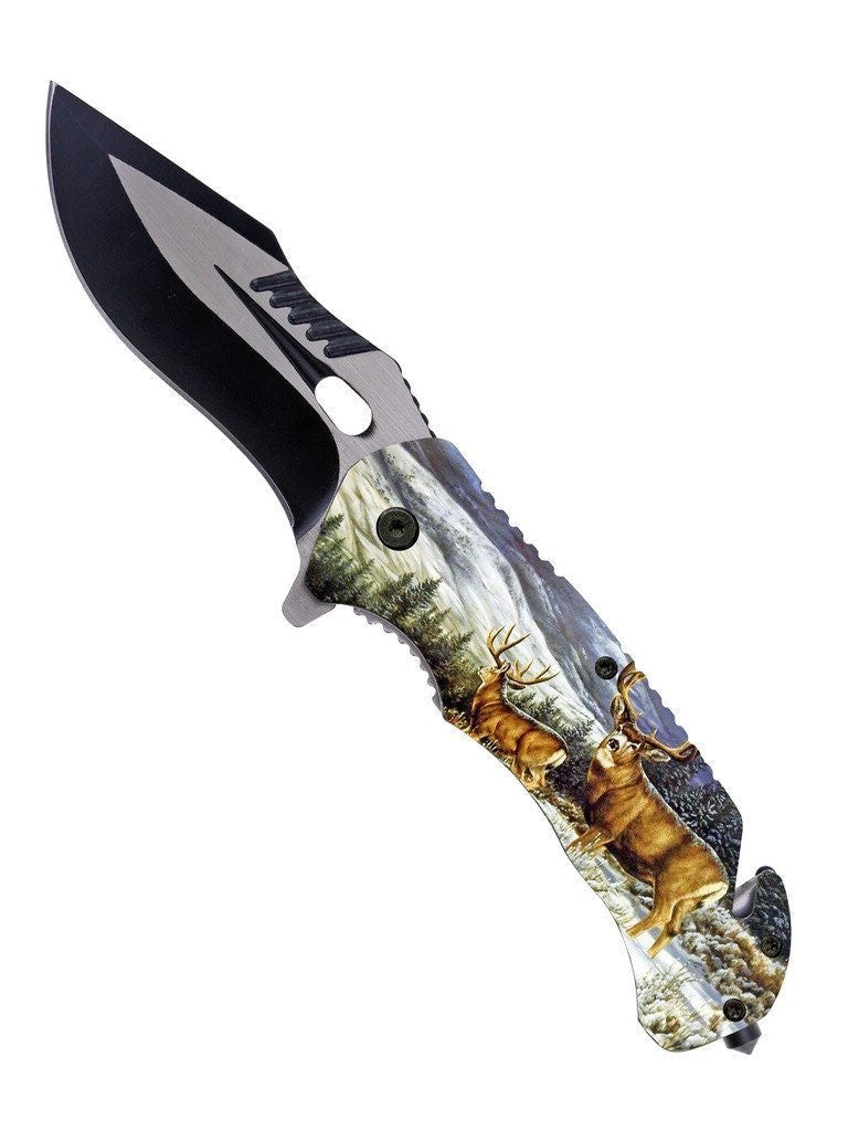 This 8" spring assisted knife features a wooden handle etched with an deer design and a black 440 stainless steel coated blade. It also includes a belt clip, seatbelt cutter, and glass breaker, offering enhanced versatility and safety.