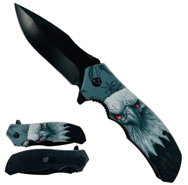 This 8" spring assisted knife is perfect for work or outdoor use. It features an eagle design on the durable handle constructed from 440 stainless steel. The overall length of the knife is 8", making it easy to carry and use.