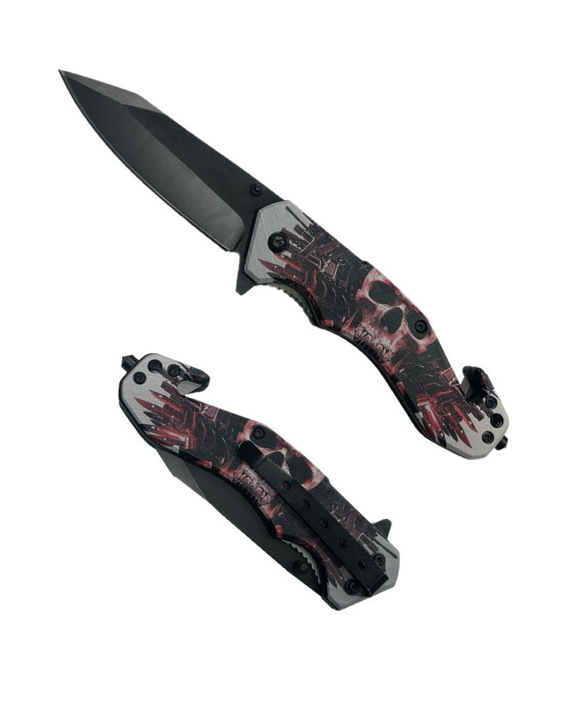 This Knife boasts a 3.5” 420 stainless black coated steel blade and a 4.5” UV Skull printing plastic handle, combining for an overall length of 8”. With a cutter and glass breaker included, users can benefit from the hard-wearing durability and precision of this product. It is perfect for a range of cutting and heavy-duty tasks.
