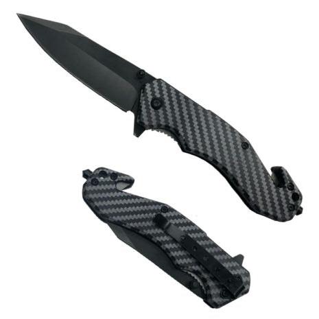 This Knife boasts a 3.5” 420 stainless black coated steel blade and a 4.5” UV printing plastic handle, combining for an overall length of 8”. With a cutter and glass breaker included, users can benefit from the hard-wearing durability and precision of this product. It is perfect for a range of cutting and heavy-duty tasks.