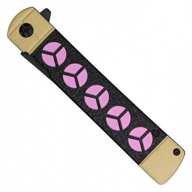 This 9-inch spring-assisted fantasy pocket knife features a 4-inch two-tone steel blade with graphic detailing, complemented by a 5-inch tan, black, and pink katana-style handle. It comes equipped with a belt clip for convenient and secure carry.