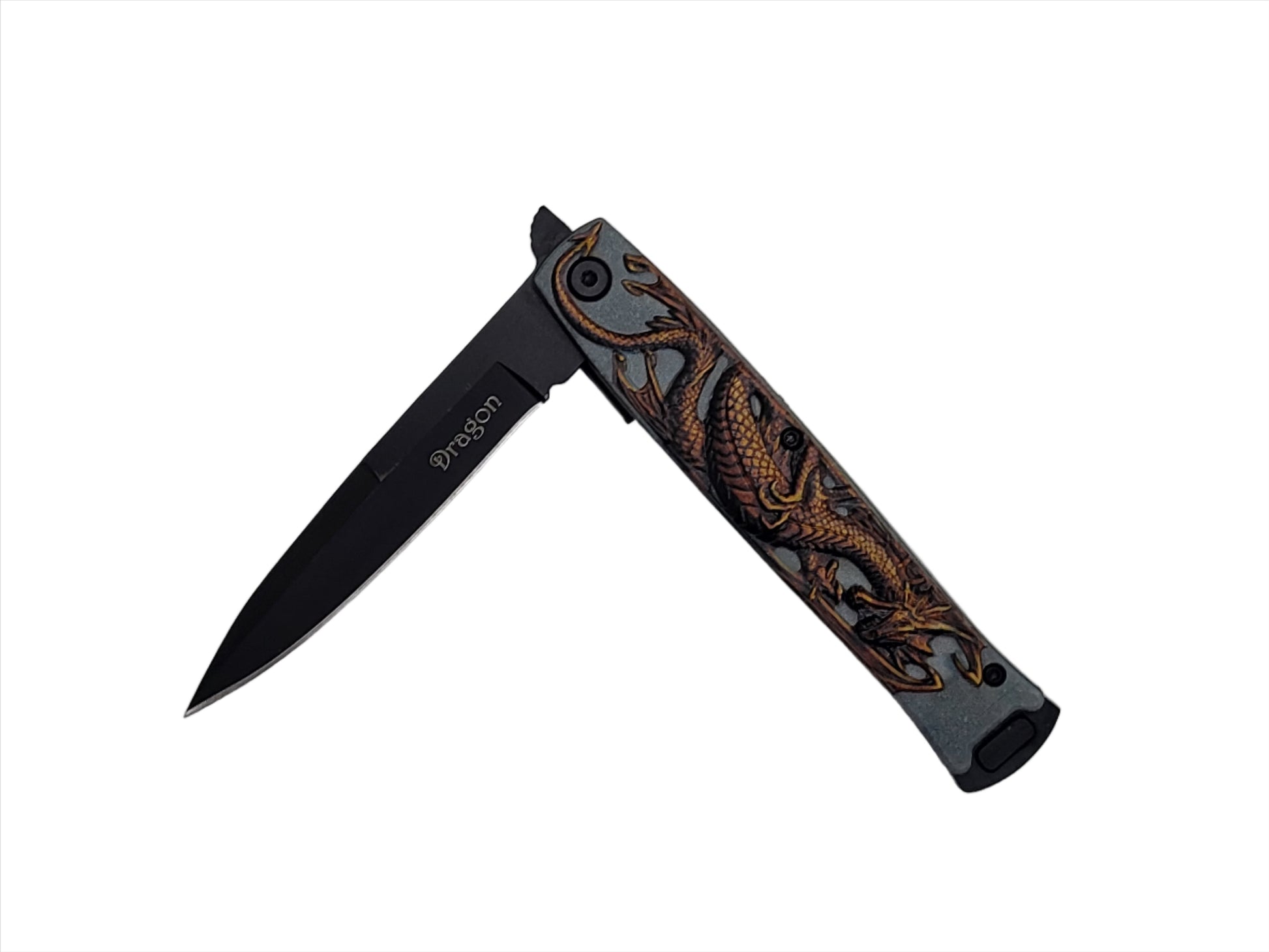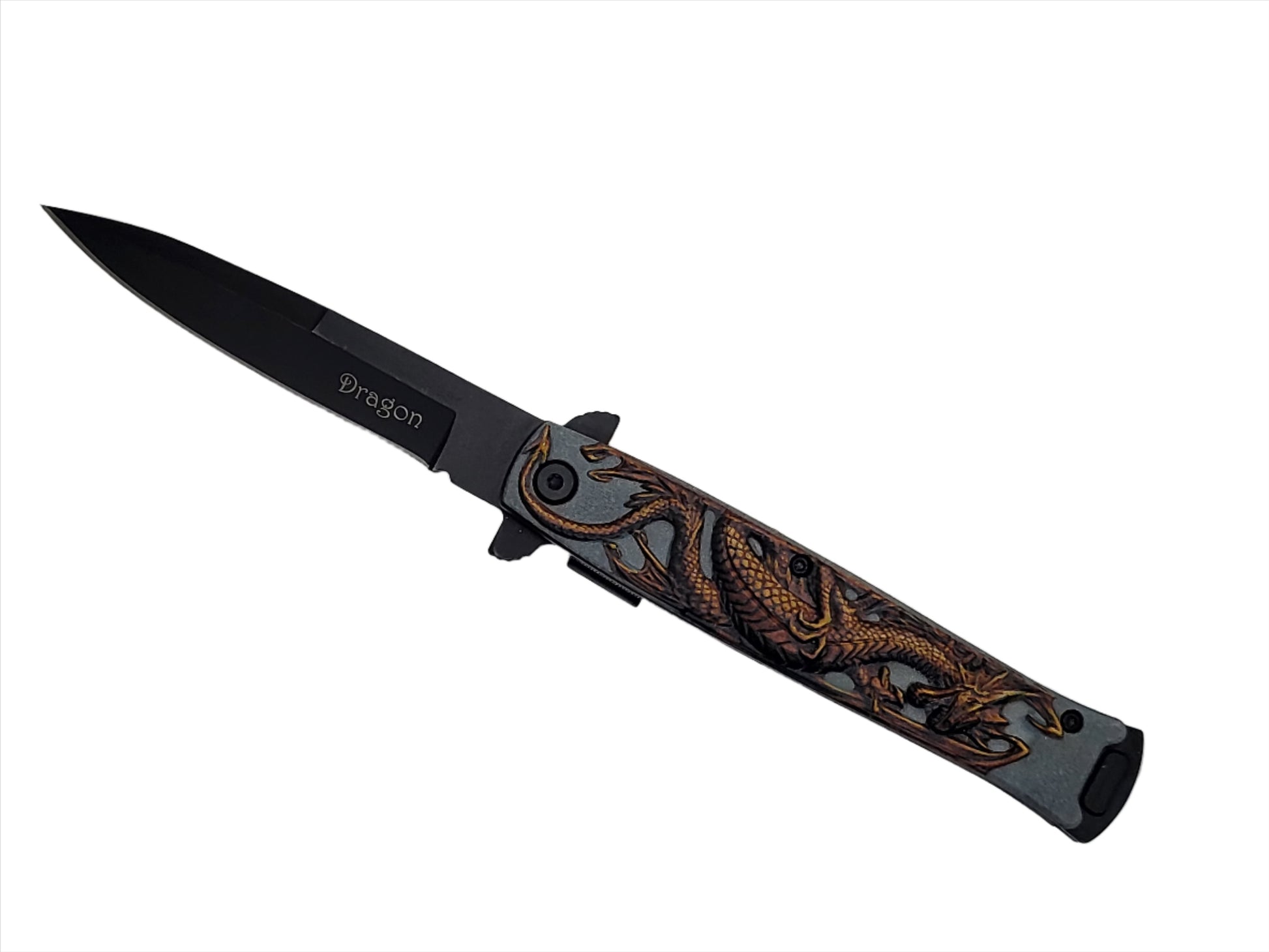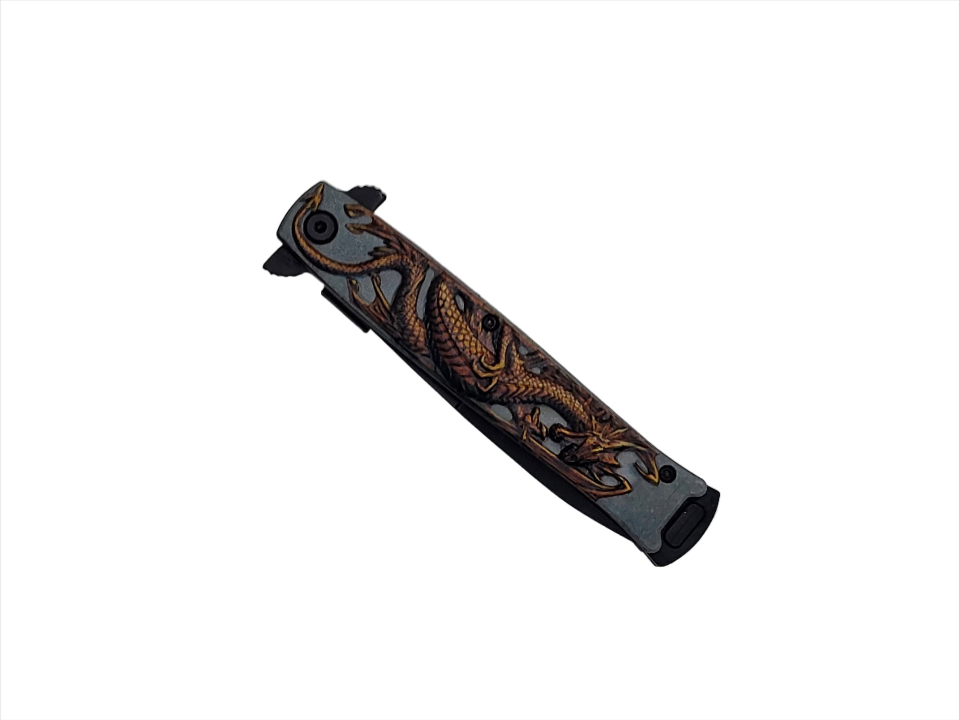 The Falcon 8" Overall Spring Assisted Knife W/ Yellow Dragon Handle is an excellent choice for any knife enthusiast. With an 8" overall length and a 440 black coated stainless steel blade, it offers a great balance between sturdiness and flexibility to ensure a wide variety of cutting tasks can be completed efficiently. The 5" Yellow ABS handle with a Yellow dragon grip provides additional comfort and control during use.